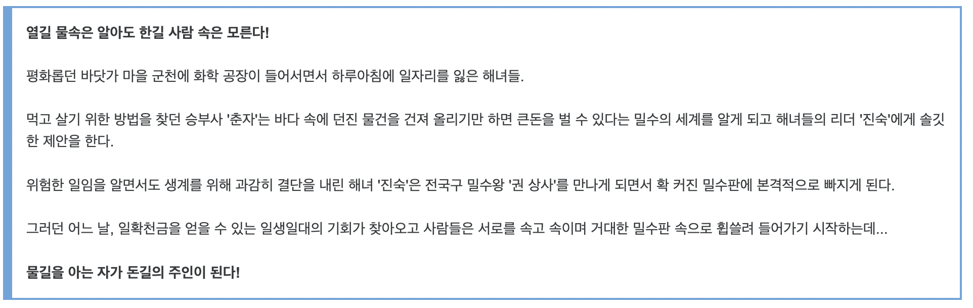 평화롭던 바닷가 마을 군천에 화학 공장이 들어서면서 하루아침에 일자리를 잃은 해녀들이 밀수에 뛰어드는 이야기입니다. 해녀들은 리더 진숙의 지휘 하에 밀수일을 하다 어느 날, 일확천금을 얻을 수 있는 기회를 포착하게 됩니다. 해녀들은 그 기회를 잡기 위해 서로를 속고 속이기 시작합니다.
