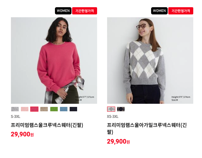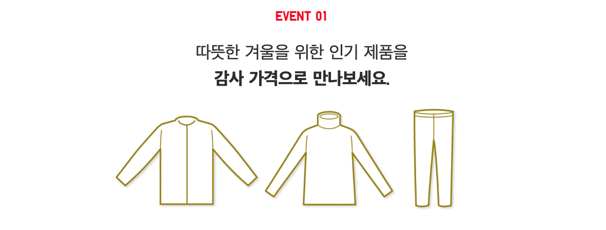 따뜻한 겨울을 위한 인기제품인 히트텍, 다운 코트, 터틀넥 스웨터, 보아 스웨트 팬츠등을 특별가격으로 만나 볼 수 있습니다. 인기제품 할인 이벤트는 23일까지만 진행되니 얼른 서두르셔야 합니다!
