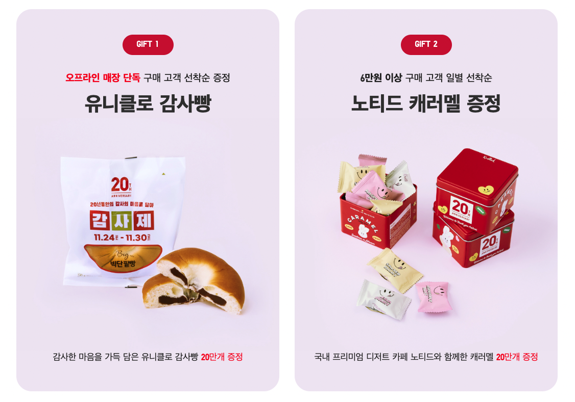 유니클로 20주년 감사제를 기념해 국내 브랜드와 협업한 선물을 감사제 기간 구매자에게 증정한다고 합니다. 선착순으로 진행되는 이벤트이며 일별 재고 소진 시 조기 종료된다고 하니 이점 참고하시길 바랍니다.