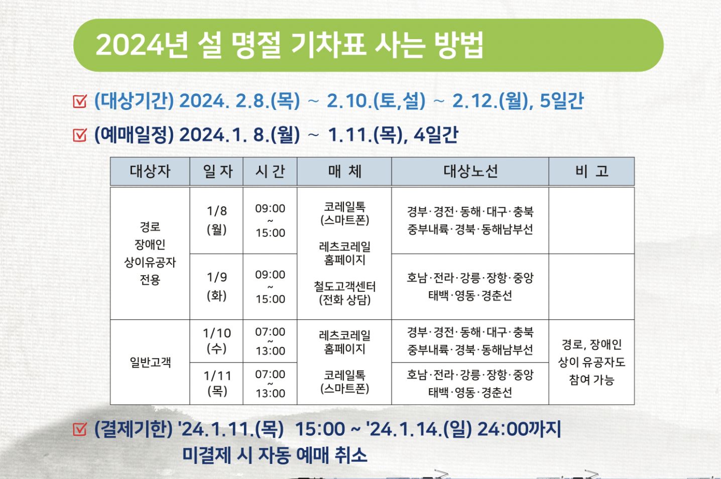 이번 2024년 설날 연휴는 2월 9일 금요일 부터 2월 12일 월요일까지 총 4일 입니다. 설날 연휴는 2월이지만 기차표 예매 기간은 1월에 진행되는것을 아시나요? 매년 명절 기차표는 한달 전쯤 코레일에서 미리 예매를 해야 구할 수 있는데요, 이번에도 한달 전부터 설날 기차표 예매가 시작됩니다. 코레일 홈페이지에 나온 공지사항을 토대로 보기 쉽게 요약 해드릴테니 이거 보시고 명절 기차표 예매 성공하시길 바랍니다!
