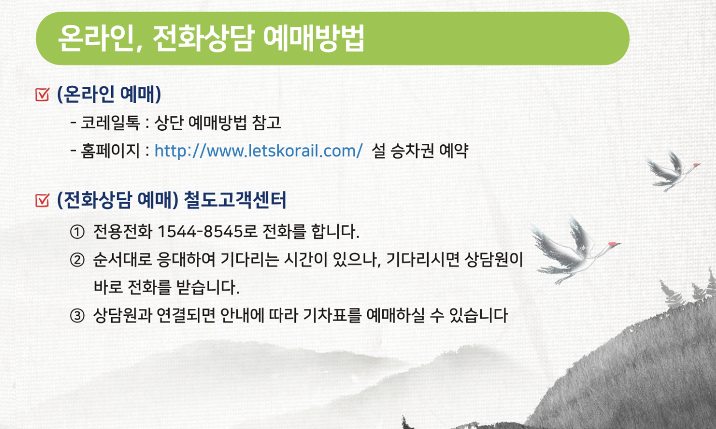 - 설 승차권 예매는 PC, 모바일, 전화 예매 (일부)로 시행하며, 역, 판매대리점, TMO 등에서 구입하실 수 없습니다.